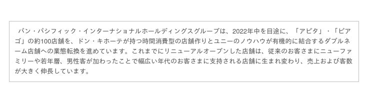 今回、業態転換する富士吉原店は、「MEGAドン・キホーテ」及び「アピタ」の強みを存分に活かした商品を豊富に取り揃えるとともに、「ドン・キホーテ」ならではのトレンドを意識した感性豊かな商品とPOPなどの空間演出で、お客さまにお買い物の『ワクワク・ドキドキ』を提供する店舗空間を創造します。