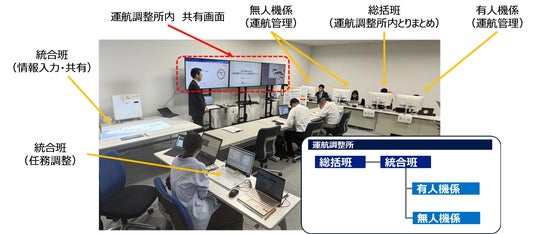 「運航調整所」では、有人機・無人機が飛行する前日の調整から、飛行当日の運航監視、当日に発生した緊急任務を有人機・無人機に割り当てる対応(任務割当)までを一連の流れとして想定し、これらの業務を対象とした実証シナリオを設定しました。(図1、図2)