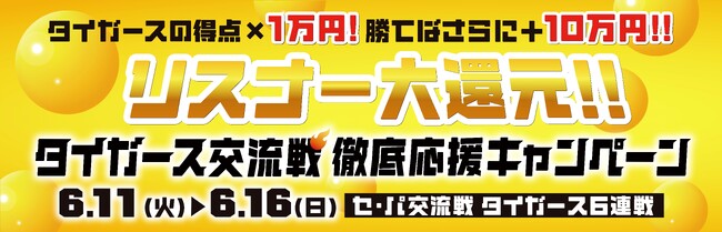 ABCラジオのプロ野球中継『ABCフレッシュアップベースボール』では、6月11日(火)から行われるセ・パ交流戦6連戦で、タイガースの得点×1万円、勝てばさらに+10万円を1名の方にプレゼントする「タイガース交流戦徹底応援キャンペーン」を今年も開催します。