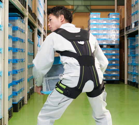 まるで衣服のような着用感の薄型アシストスーツです。本体の重量は約560g※と軽量でありながら、力強いアシストで腰や背部の負担を軽減します。ワンタッチでアシストのON/OFFが可能なため、着脱の手間がなく、装着したまま複合的な動きが可能です。