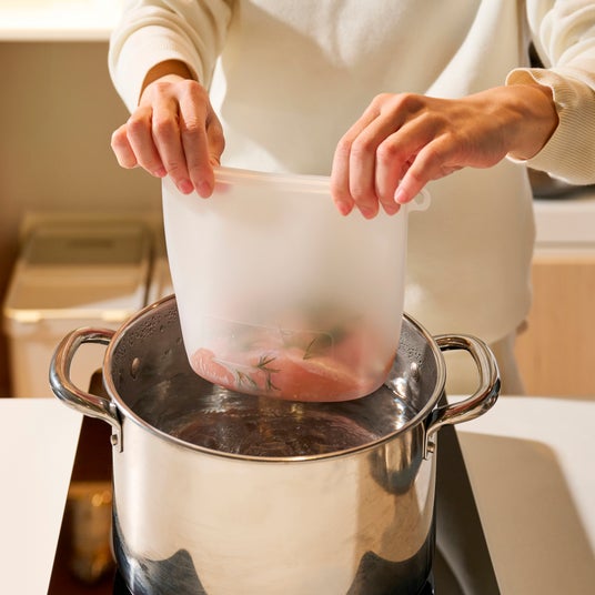 3つのサイズ違いで使い分けができる保存バッグ。便利なジッパー付きで、電子レンジで簡単にケーキを作ったりパスタをゆでたりできます。80°までなら湯せん調理にも対応しています。
