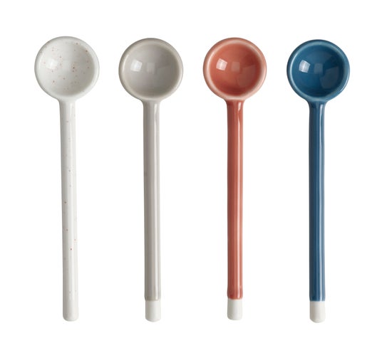耐久性のある磁器製のスプーン。異なる4色の小さくて表情豊かなこのティースプーンは、すっきりとした丸みを帯びた形で、ジャムやハチミツ、塩、オリーブオイルを取り分けるのに最適です。また、デザートに色を添えるにもぴったりです。