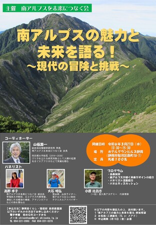 「南アルプスを未来につなぐ会(会長:山極壽一)」は、ユネスコエコパークに登録され世界の宝である南アルプスの魅力と未来を語るシンポジウム「“南アルプスの魅力と未来を語る”~現代の冒険と挑戦~」を開催します。(別添チラシ参照)