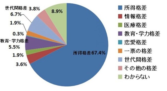 さまざまな格差がある中で「所得格差」を挙げた人が突出していて67.4%を占めました。2位以下の「世代間格差」「教育・学力格差」「情報格差」「医療格差」「一票の格差」はいずれも一桁の%にとどまっています。