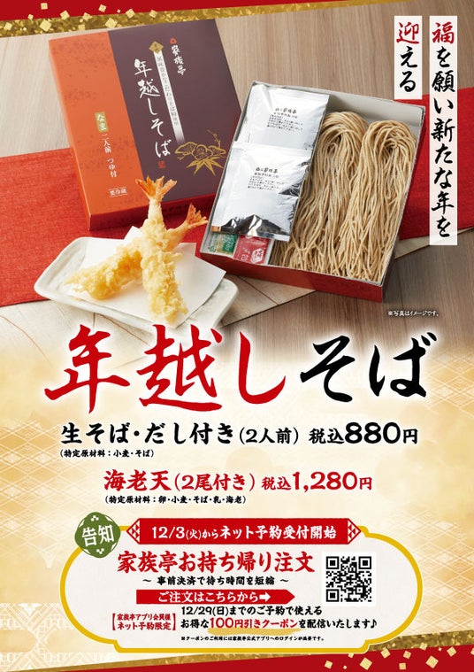 事前予約は、2024年11月1日(金)から店頭・電話での注文に加え、12月3日(火)からは、スマホから事前に注文・会計まで済ませられるお持ち帰り注文(ネット予約)でのご予約を開始します。何かと忙しい年末に、決済も事前に済ませて、店頭でスムーズに商品をお受け取りいただけます。また、家族亭アプリの会員になることで、お持ち帰り注文(ネット予約)で使えるお得なクーポン券をお使いいただけます。ぜひ、この機会に家族亭アプリ会員にご登録いただき、お得なクーポンを利用して家族亭の年越しそばをご予約ください。
