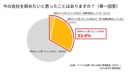 マイナビ転職が、2024年6月に調査を行なった『新入社員の意識調査(2024)』によると、昨年6月時点で会社を辞めたいと思ったことがある新入社員は33.4%という結果が出ています。