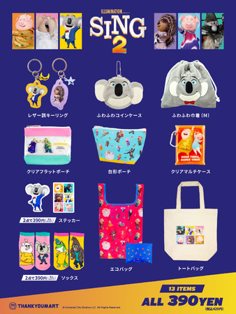 『SING/シング』は『ミニオンズ』、『怪盗グルー』シリーズなど、世界中で愛される作品を生み出し続けるイルミネーション・エンターテインメント作品で、2017年に日本公開し週末動員ランキング4週連続1位&最終興収51億円超えの大ヒットを記録した作品です。世界で唯一全編吹替版の制作が許された日本では、豪華声優キャストと制作陣が集結した音楽面の完成度の高さも大きな反響を呼び、インターナショナル興収(アメリカ以外の国と地域の成績)でも日本がNo.1になる大ヒットを記録しました。今回は待望の続編となる新作映画『SING/シング:ネクストステージ』の公開を記念したサンキューマート限定のコラボアイテムとなり全13アイテムで展開します。