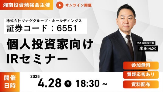 株式会社ツナググループ・ホールディングス(本社:東京都中央区、代表取締役社長:米田 光宏、以下当社)は、2025年4月28日(月)に、湘南投資勉強会主催の個人投資家向けIRセミナーに登壇いたしますので、下記の通りお知らせいたします。