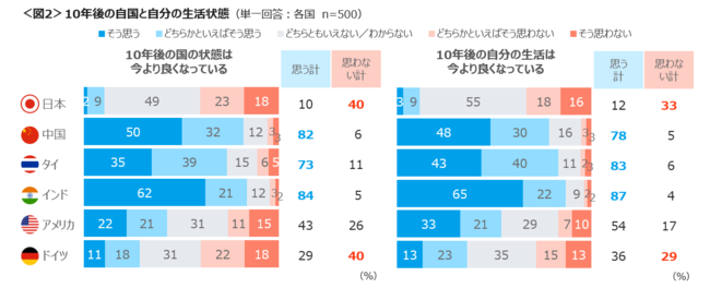 「10年後の国の状態は、今より良くなっている」は、インド84%、中国82%、タイ73%が高い。「10年後の自分の生活は、今より良くなっている」についても、インド87%、タイ83%、中国78%と高く、このアジア3か国の将来への展望は明るい見通しであった。一方、日本は、国、自分の生活ともに”今より良くなっていると思わない割合”が高く、将来の見通しは明るくないといえる。日本に次いで国、自分の生活ともに”思わない割合”が高いのはドイツであった。<図2>