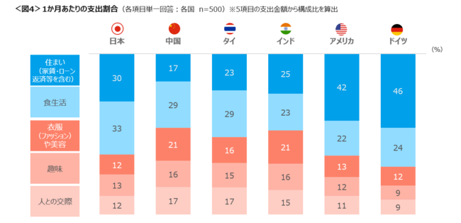 5分野について1か月あたりのおおよその支出金額を確認し構成比を算出した。「住まい」に最も支出をしている国は、ドイツとアメリカで4割台、次いで日本が3割。日本は「食生活」の割合が最も高く小差で「住まい」が続く。「生活コスト(住まい+食生活)」の支出割合が6割を超えるのは、ドイツ、日本、アメリカの3か国であった。<図4>