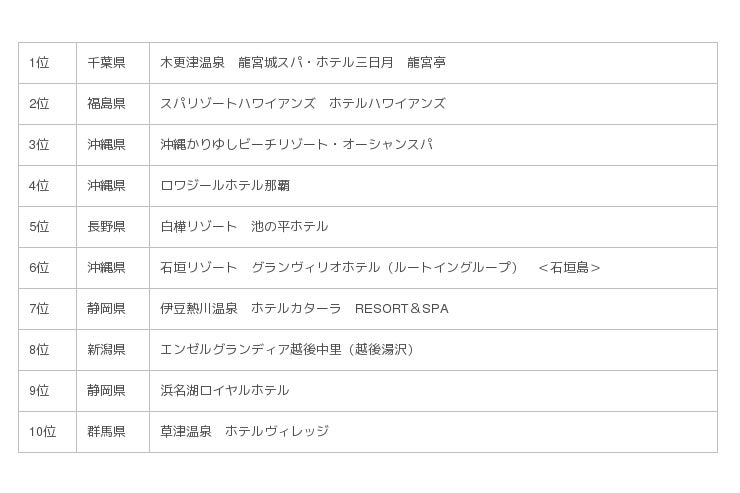 レジャー宿を対象に「プール」プランの宿泊人泊数(宿泊延べ人数)を元に集計した結果、1位は千葉県の「木更津温泉 龍宮城スパ・ホテル三日月 龍宮亭」、2位は福島県の「スパリゾートハワイアンズ ホテルハワイアンズ」、3位は沖縄県の「沖縄かりゆしビーチリゾート・オーシャンスパ」がランクインしました。