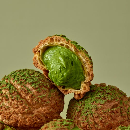 初夏の味わい「シガール オゥ マッチャ」と同じ「宇治抹茶」を使用した抹茶のクッキーシューです。使用している宇治抹茶は茶師が数種類の茶葉から厳選したオリジナルブレンド。宇治抹茶の香りと旨み、そして抹茶本来の味わいを十分にお楽しみいただけます。旨味や香りが引き立つ宇治抹茶を合わせた自家製の宇治抹茶カスタードクリームがたっぷりと詰まっており、やさしいバニラの風味が抹茶の味わいを引き立たせます。「シガール オゥ マッチャ」とともに、ヨックモックの抹茶シリーズで初夏の季節をお楽しみください。