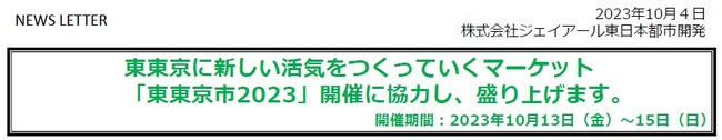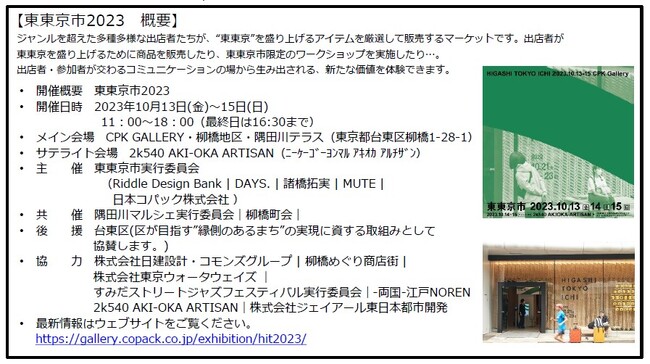 ジェイアール東日本都市開発は、2023年10月13日(金)~15日(日)に行われる「東東京市(ひがしとうきょういち)2023」へ協力いたします。総武線浅草橋~両国駅間高架下にてキッチンカー出店・革製品ワークショップや、サテライト会場となる、2k540 AKI-OKA ARTISANでワークショップを実施します。また、東東京市と共同開催される様々なイベントを巡るデジタル形式のスタンプラリー「SpotTour」も開催されますのでご案内いたします。