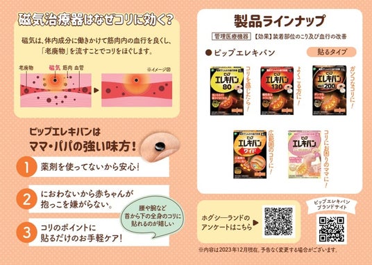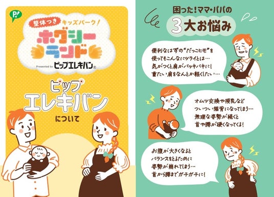 「ホグシーランド」参加者には、育児疲れのママパパをサポートするピップエレキバンおすすめの貼り方をまとめたチラシをプレゼントします。