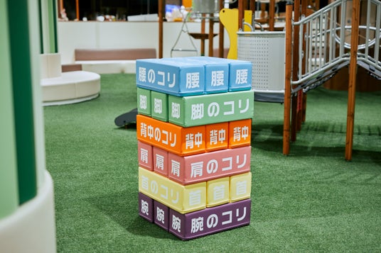 コリ崩しブロックは、育児シーンで発生する、様々な部位のコリをあしらったブロックを子どもたちが崩す様子を、施術を受けているママやパパが見ることで、視覚からも体中のコリをほぐそう、という想いを込めました。お子様が安全に遊べるよう、ブロックは軽い素材で制作しました。