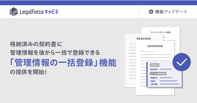 株式会社LegalOn Technologies(本社:東京都江東区 代表取締役執行役員CEO:角田望)は、AI契約管理システム「LegalForceキャビネ」において、LegalForceキャビネにアップロード済みの契約書の管理番号や、企業ごとに任意で設定できる「カスタム管理項目」を一括で登録できる「管理情報の一括登録」機能の提供を開始いたします。これにより、過去の契約書を企業ごとに設定した項目で管理、検索が可能になり、契約書を探す手間を軽減します。