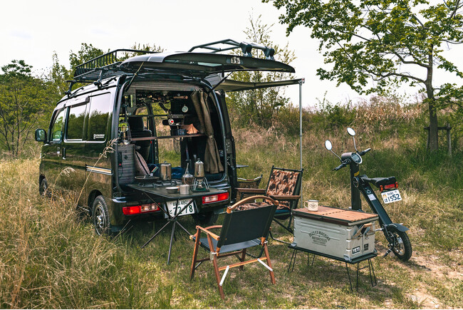 その1つとして、軽バンライフをさらに楽しんでいただくために、「NEXT CAMPER」×「CUSTOM BORDERLESS」の特別仕様を実現。自分だけの「動く秘密基地」をお楽しみ下さい。