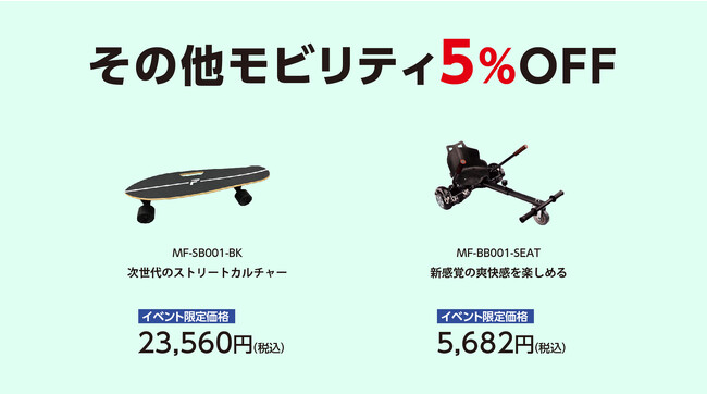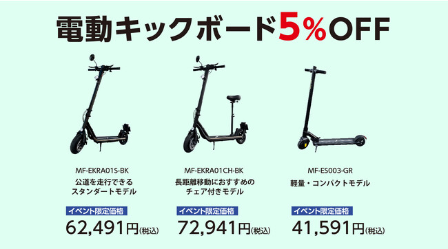 電動キックボードは、1台目5%オフ、2台目購入でさらに5%オフのセール価格で販売いたします。