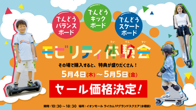 パーソナルモビリティブランドMEISTER.Fは、イオンモール沖縄ライカムのグランドスクエア(1F)にて、5月4日(木)と5日(金)に「モビリティ体験イベント For Kids」という、重心移動で運転をコントロールする新感覚モビリティの「電動バランスボード」、公道走行対応の「電動キックボード」の試乗・販売会を開催致し、電動モビリティを特別価格で販売します。