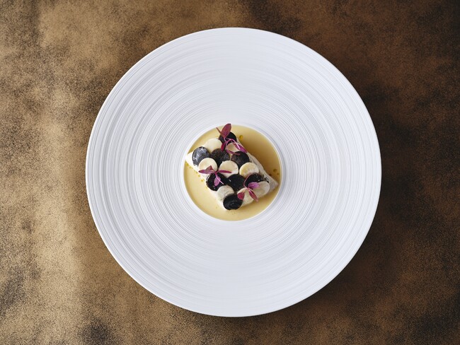 低温調理をした肉厚な真鯛に帆立貝のムースを重ね、トリ ュフとマッシュルームで鱗を表現した遊び心のある一品。 ポルチーニのバターソースでお召し上がりください。