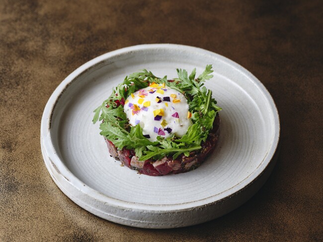 タプナードソースで味付けをしたマグロのタルタルに、自然薯のエスプーマと春菊をのせた一皿。中には鶉のポ ーチドエッグとキャビアをしのばせています。