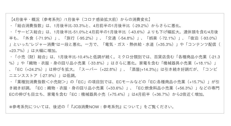 本日、JCB消費NOWの4月後半(4月16日~4月30日)、4月全体(4月1日~4月30日)の速報値の一部を公開します。また、現在ナウキャストとJCBでは、新型コロナが消費に与える影響をより詳しく分析するため「参考系列」データを算出しており、1月後半の新型コロナウイルス感染症拡大前に比べて足元の消費がどう変化しているかも併せて公開します。