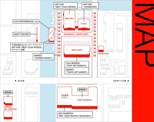 会 場:東京・天王洲運河一帯 アートエキシビション「SSS: Super Spectrum Specification」|寺田倉庫G1ビル ★ 、アートフェア「MEET YOUR ARTISTS」|B&C HALL 、アートフェア「CROSSOVER」|E HALL 、トークセッション|WHAT CAFE ★ 、ライブパフォーマンス/DJ|T-LOTUS M ★、TOKYO ART MARKET|WHAT CAFE、OUTSIDE MARKET|ボードウォーク/ボンドストリート