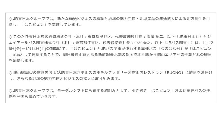 近年では、モーダルシフトの促進のため、新幹線や在来線特急列車を活用した荷物輸送を促進し、JRバス関東においても高速バスを活用した野菜輸送などを推進しており、今回、新幹線と高速バスの連携による鮮魚輸送を実施します。