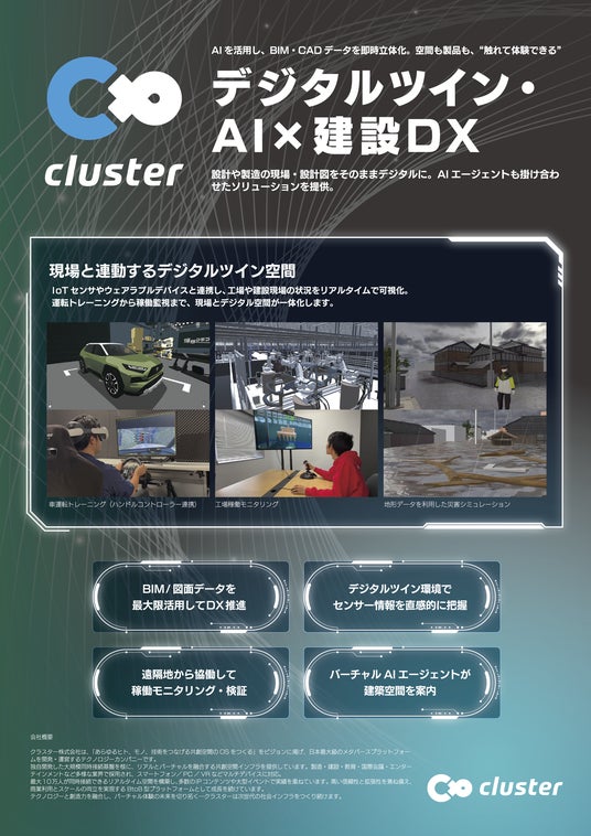 また、会期中の3日間、クラスター社のブースでは鹿島建設をはじめとする、様々な業界との建設・産業DX領域での共創事例のデモを用意しております。「3D空間を使ったAI・デジタルツイン・遠隔協働(シミュレーション)―インダストリアルメタバースで現場と経営をつなぐ」をテーマに、クラスターが持つ独自のメタバース技術や産業DX領域で培ってきた知見について、わかりやすくご説明いたします。
