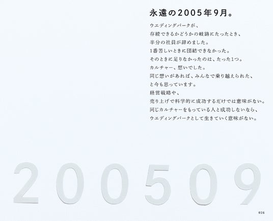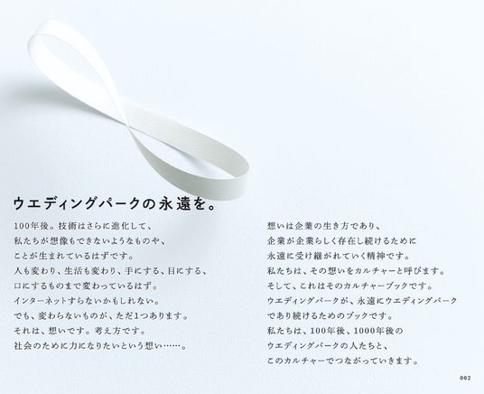 共に働く仲間と手を取り合って喜んだ時も、超えていかねばならない困難が立ちはだかった時も、自分の未熟さに涙した時も、いつも、どんな時でも、勇気になり、厳しい言葉になり、振り返る場所になり、未来を考える場所になり、私たちを支えてくれるもの。それは「カルチャー」だと信じています。今回制作したカルチャーブック「Wedding Park Ship」を心に、私たちはこれからも理念とビジョンの実現に向かって邁進してまいります。