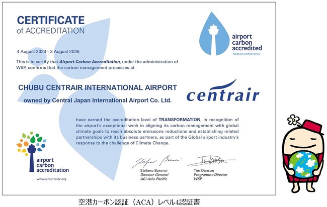 中部国際空港(所在:愛知県常滑市)は、国際空港評議会(ACI: Airports Council International)により創設されたカーボン認証プログラム、空港カーボン認証(ACA:Airport Carbon Accreditation)のレベル4(Transformation)を取得しました。