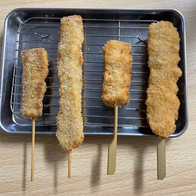(写真左から:通常サイズの「串カツ牛」、「メガ牛」、通常サイズの「串カツ豚」、「メガ豚」)