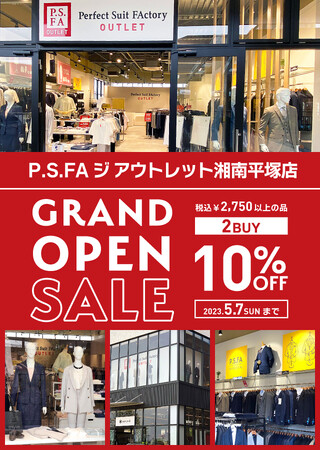 はるやま商事株式会社(本社:岡山県岡山市、代表取締役社長 中村 宏明)が展開するブランド、「Perfect Suit FActory」(2023年3月末日時点 66店舗)は、「Perfect Suit FActory ジ アウトレット湘南平塚店」を2023年4月28日(金)にグランドオープンいたします。