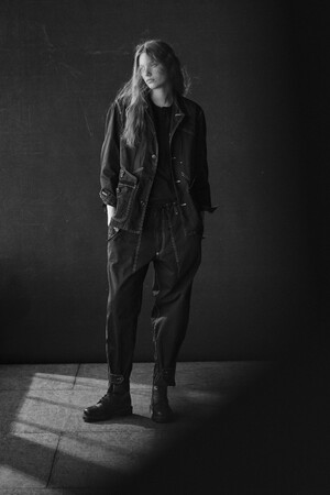 ジャケット・パンツは、10ozのインディゴデニムと高密度のコットンチノの2素材を展開。アイテムと素材によって異なるディテールを施しています。ジャケットはカバーオールをイメージし、パンツはYohji Yamamoto POUR HOMMEの定番型を元にアップデートされたデザインとなっています。また、縫製箇所によって太さと色の異なる3種類の糸を使い分け、ヴィンテージのワークウェアに見られる仕様を再現しています。