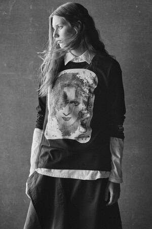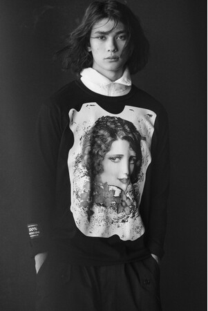 新たに登場したアイテムは、オフホワイトのステッチや、ワークウェアに由来するポケットの表現が印象的なジャケット・パンツと、魅惑的な眼差しを向ける妖艶な女性の顔を用いたアートワークを施したカットソー。