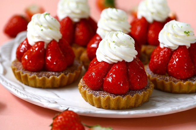 鮮やかなの苺を全面にデコレーションした、季節限定のタルト。口の中に苺のジューシーな果汁が溢れだすなんとも贅沢な一品です。アーモンドクリームが香ばしいタルト生地と、中に入れたカスタードクリームのまろやかさ、苺の甘酸っぱさを一緒にお楽しみいただけます。旬の苺を存分に堪能したい方にぴったりのスイーツです。