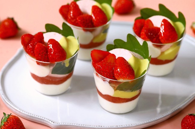 メレンゲを混ぜ合わせた"ふわっ"と柔らかな食感の苺のムースに、苺ゼリーとカスタード風味のソースを合わせました。 ムースのやさしい味わいと苺ゼリーのとろっとした舌触りが絶妙なバランスを生み出しています。