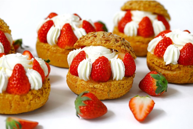 毎年人気の「苺のシュークリーム」。朝一番で焼き上げた、サクッと香ばしいシュークリーム生地に、なめらかなカスタード、ホイップクリームクリームを合わせて苺を飾り付けました。お子さまから大人まで、老若男女問わず好まれるシュークリームは、手土産にも喜ばれること間違いなしです。
