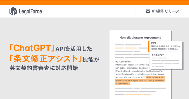株式会社LegalOn Technologies(本社:東京都江東区 代表取締役執行役員CEO:角田望、以下LegalOn Technologies)は、AI契約審査プラットフォーム「LegalForce」において、Azure OpenAI Serviceの「ChatGPT」APIを活用し、契約書の修正をサポートする「条文修正アシスト」機能が英文契約書に対応開始することをお知らせします。本機能の搭載により、「LegalForce」での契約審査業務のさらなる効率化を支援します。
