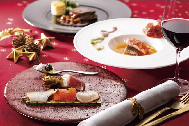 クリスマス期間限定、乾杯用のシャンパンが付いた2種類のディナーコース。高層ビル群が織り成す汐留の夜景とシェフが腕を奮うお料理をお楽しみください。
