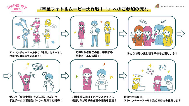 「SPRING FES2022」を開催いたします。開催期間のうち、3月の平日(計8日間)限定で、この春に高校・大学・専門学校を卒業する学生の皆様から「卒業」をテーマにした映像作品の企画を募集、パークにご招待し、