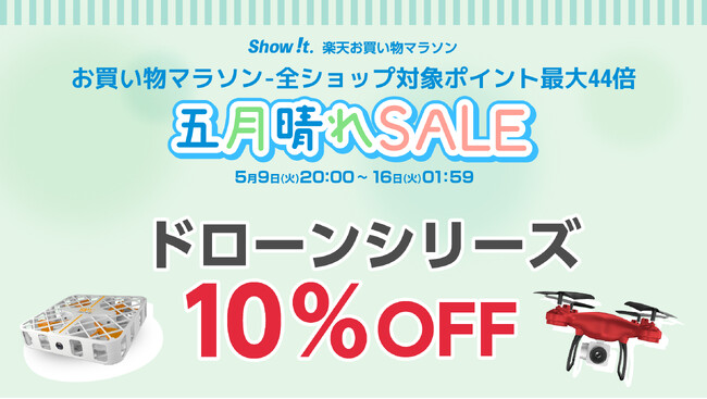 楽天市場「Show !t」は、5月9日(火)20:00~5月16日(火)01:59までポイント10倍プレゼント・全商品送料無料の楽天スーパーセールに参加します。さらに、運転操作が楽しく、私有地で運転操作や動画と静止画を上空から撮影できるトイドローン2種類の10%OFFセールを開催が決定。外でスポーツやドローンを飛ばしてこれからの季節を楽しむ事にぴったりなアイテムを、お得にGetしましょう。