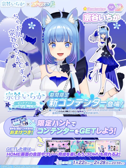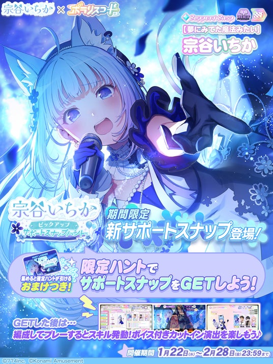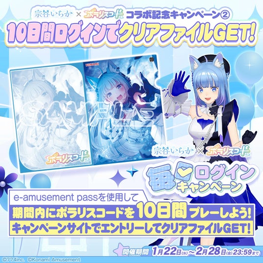 株式会社コナミアミューズメントは、全国のアミューズメント施設にて音楽ゲーム『ポラリスコード』と、774株式会社が運営するVTuberプロダクション「ななしいんく」の『宗谷いちか』とのコラボレーションイベントを1月22日(水)から開催することをお知らせします。