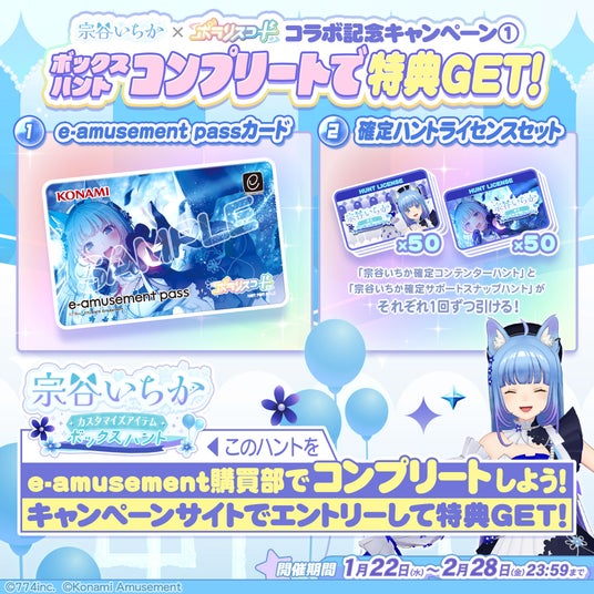 「e-amusementサイト」内の「購買部」にて、『宗谷いちか』のカスタマイズアイテム「宗谷いちかカスタマイズアイテムボックスハント」をすべて購入し、応募した方全員にe-amusement passカードをプレゼントします。