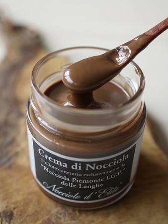 ベースのカスタードクリームは意図的にさっぱりめに作り、そこにリッチで重厚なコクのあるイタリアピエモンテ産のIGPヘーゼルナッツペーストを混ぜ合わせました。「IGP」はイタリア語のIndicazione Geografica Protetta(保護指定地域表示あるいは地理的表示保護)の略語で、EU(欧州連合)が認める農産物の「ご当地生産物」の一定の基準を満たした産物にIGPマークが付けられます。