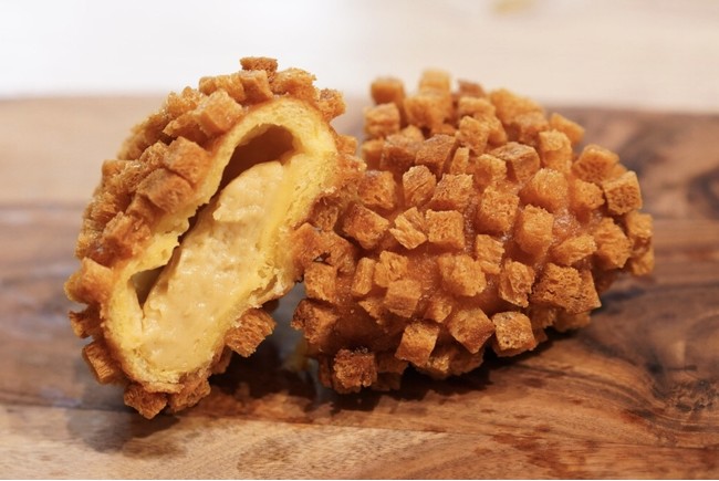 栗のような甘さのヘーゼルナッツペーストが、風味を持ち上げるような軽いカスタードクリームに溶け合います。また、外皮のザクザク食感とクリームのなめらかな舌触りとの対比、クルトンの香ばしさとナッティーな風味との調和も味わいどころです。予想外の贅沢な美味しさに驚くはずです。