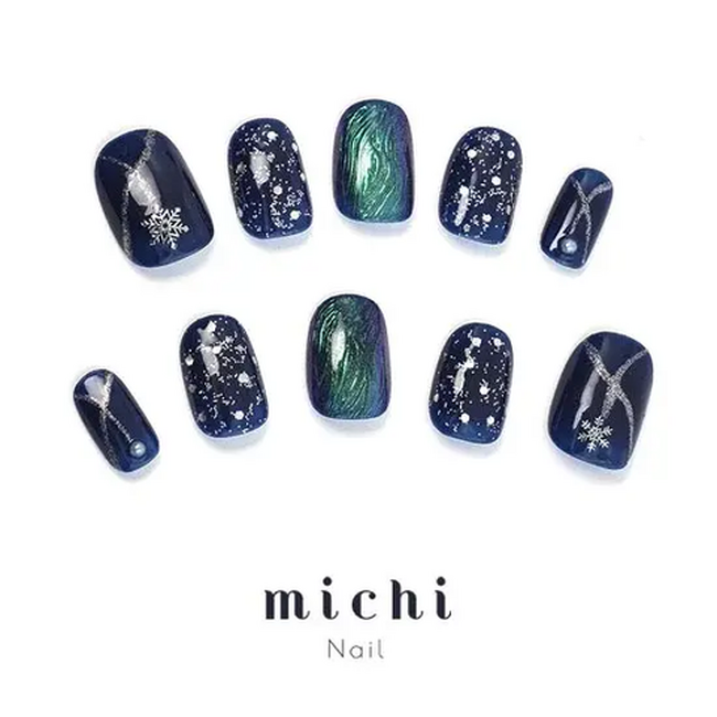 ネイビーカラーのキラキラ雪の結晶ネイル・インク×マグネットのニュアンスネイル・ミントグリーンのオーロラタイダイネイルetc