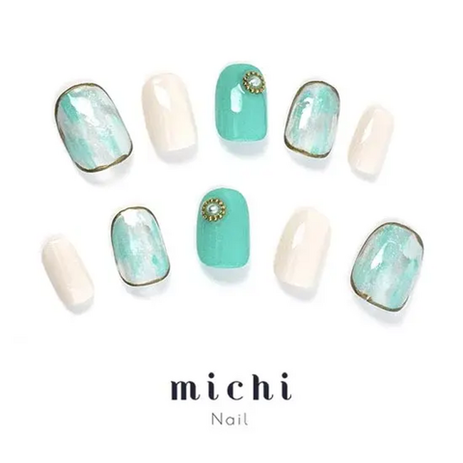 ミントグリーンとホワイトが可愛いタイダイネイル。ゴールドの囲みラインで高級感も感じられるデザインです。ミントカラーを普段使わない方もつけやすいネイルチップに仕上がっています。