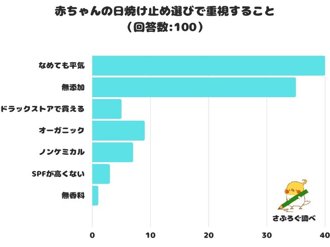 赤ちゃんの日焼け止め選びで重視することをアンケートにて調査したところ、1位は「なめても平気」 でした。