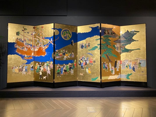 日本に来航したポルトガル船の上陸場面をモチーフとした、近世初期風俗画の一主題。南蛮人の色鮮やかな装いや装飾品、表情、動物など綿密な描写を、六曲の屏風にダイナミックな構図で配しています。木地製作から完成まで、実に4年もの歳月をかけた類稀な傑作です。